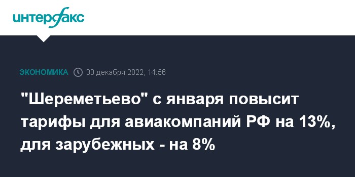 Москва. 30 декабря. INTERFAX.RU - АО "Международный аэропорт "Шереметьево" (МАШ) с 1 января 2023 года повысит основные тарифы на обслуживание российских авиакомпаний почти на 13%, следует из данных на сайте аэропорта.
