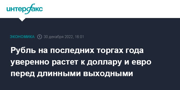 Как отмечают эксперты "Интерфакс-ЦЭА", рубль уверенно растет к доллару и евро днем в пятницу перед новогодними каникулами. Участники торгов закрывают "длинные" позиции по валюте, стремясь избежать рисков роста волатильности на следующей неделе. Валютная секция на Московской бирже в первую неделю нового года будет работать, в то время как страна в целом в это время традиционно "уходит" на длительные новогодние и рождественские каникулы.