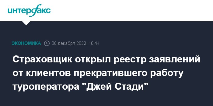 Москва. 30 декабря. INTERFAX.RU - Страховая компания "Согласие" открыла реестр заявлений на возмещение ущерба от клиентов туроператора "Джей Стади", который по решению Минэкономразвития исключен из единого федерального реестра, сообщили "Интерфаксу" в пресс-службе страховщика.