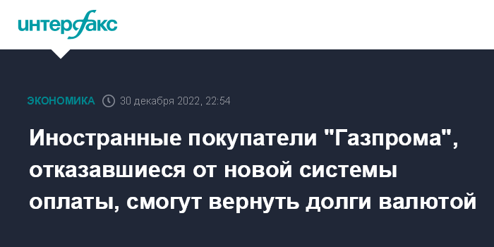 Москва. 30 декабря. INTERFAX.RU - Иностранные покупатели российского газа, отказавшиеся от перехода на новую систему оплаты с автоматической конвертацией платежа в рубли, смогут вернуть долги в валюте контракта.
