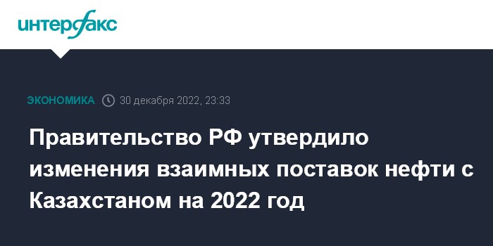 Москва. 30 декабря. INTERFAX.RU - Правительство России утвердило изменения взаимных поставок нефти с Казахстаном в 2022 году.