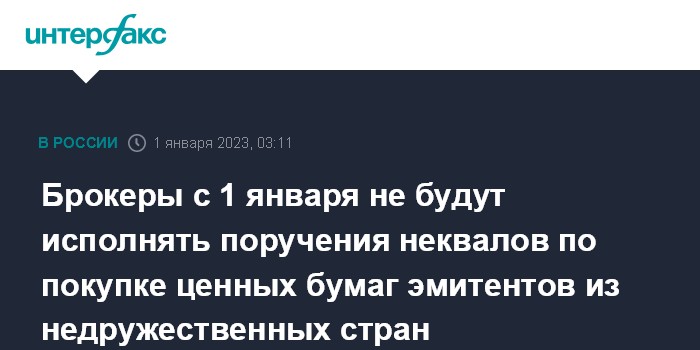 Москва. 1 января. INTERFAX.RU - Брокеры с 1 января должны будут приостанавливать исполнение любого поручения неквалифицированного инвестора по увеличению позиции по ценным бумагам иностранных эмитентов из недружественных стран.