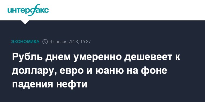 Как отмечают эксперты "Интерфакс-ЦЭА", рубль демонстрирует умеренное снижение в основных валютных парах в ходе дневных торгов 4 января под давлением заметного падения мировых цен на нефть, которое отмечается второй день подряд. При этом мировые фондовые индексы в основном показывают позитивную динамику.