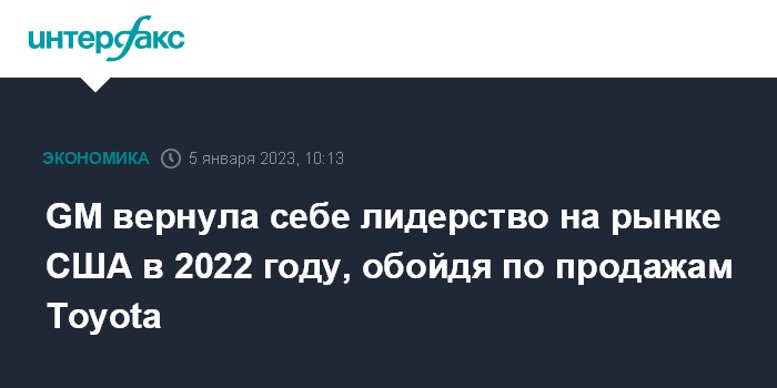 Москва. 5 января. INTERFAX.RU - Американский автопроизводитель General Motors Co. (GM) вернул себе лидерство на рынке США, обогнав по продажам японскую Toyota Motor Corp. в 2022 году.