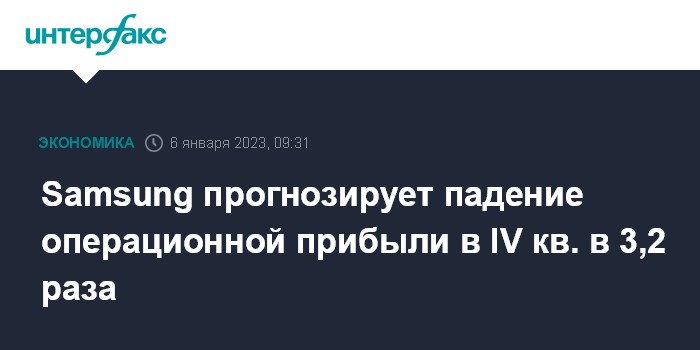 Москва. 6 января. INTERFAX.RU - Южнокорейская Samsung Electronics Co., крупнейший мировой производитель смартфонов и полупроводниковой продукции, оценивает падение операционной прибыли в четвертом квартале 2022 года в 3,2 раза.