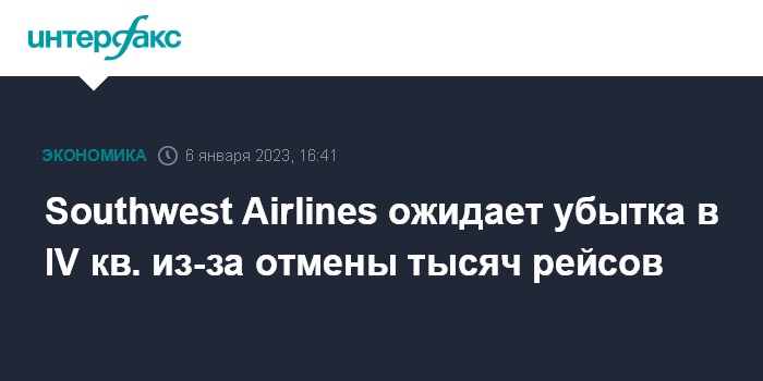 Москва. 6 января. INTERFAX.RU - Американская авиакомпания Southwest Airlines Co. ожидает зафиксировать убыток в четвертом квартале 2022 года после отмены свыше 16,7 тыс. рейсов в США из-за снежного шторма.