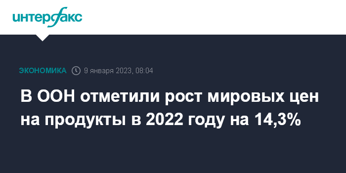Москва. 9 января. INTERFAX.RU - Мировые цены на продовольствие в 2022 году выросли на 14,3%, сообщила ФАО (продовольственная и сельскохозяйственная организация ООН).