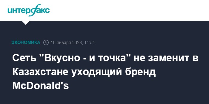 Москва. 10 января. INTERFAX.RU - В Казахстане не планируют заменить сеть фастфуда под управлением ТОО "Food Solutions KZ" McDonald's на российскую "Вкусно - и точка", сообщил журналистам гендиректор Food Solutions KZ Асет Машанов.