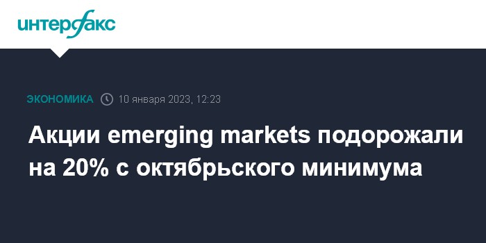 Москва. 10 января. INTERFAX.RU - Акции стран с развивающимися рынками (emerging markets) подорожали более чем на 20% с октябрьского минимума на фоне ослабления глобальной инфляции и надежд на то, что Федеральная резервная система США в ближайшее время замедлит темпы подъема процентных ставок, пишет The Financial Times.