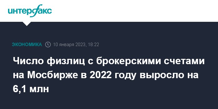 Москва. 10 января. INTERFAX.RU - Количество физлиц, имеющих брокерские счета на "Московской бирже", в 2022 году увеличилось на 6,1 млн, в декабре – на 286 тыс., до 22,9 млн человек, сообщается в пресс-релизе биржи.