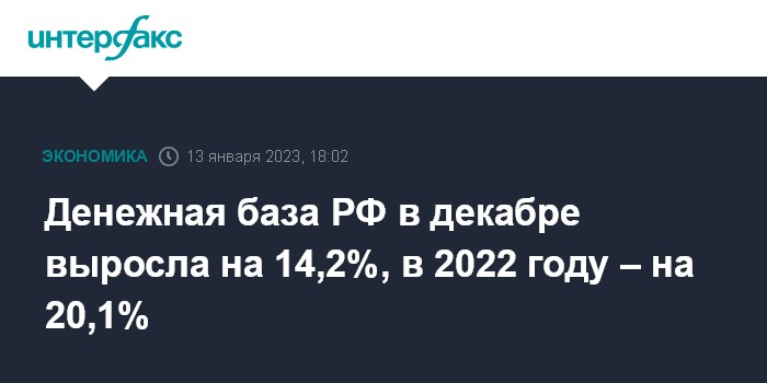 Денежная база в 2022 году увеличилась на 4 трлн 89,7 млрд рублей, или на 20,1%, с 20 трлн 338,9 млрд рублей на 1 января 2022 года.