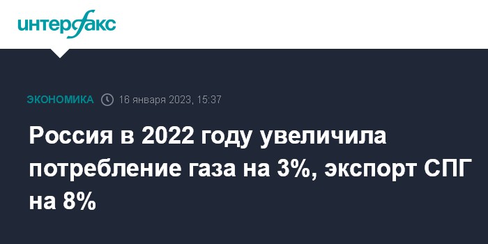Россия в 2022 году увеличила потребление газа на 3%, экспорт СПГ на 8%
