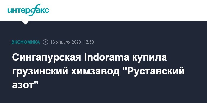 Москва. 16 января. INTERFAX.RU - АО "Руставский азот" (ранее - химкомбинат "Азот", г.Рустави, Грузия), единственный производитель минеральных и азотных удобрений на Южном Кавказе, продан компании Indorama Corporation (Сингапур), сообщило Министерство экономики и устойчивого развития Грузии.
