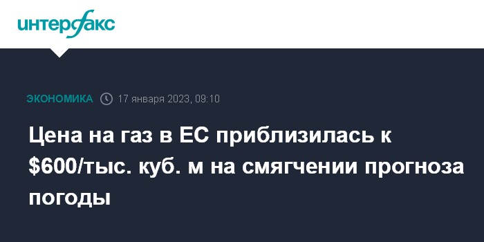 Москва. 17 января. INTERFAX.RU - Нормализация температурного трека в Европе, его приближение к погодной норме не смогли оказать поддержку ценам на газ. Они понизились почти до $600 за тысячу кубометров.