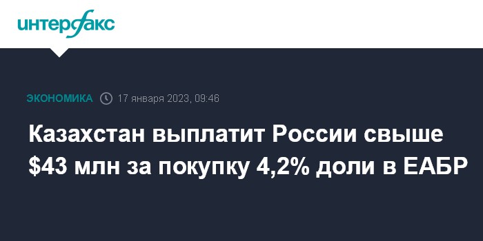 Москва. 17 января. INTERFAX.RU - Казахстан выплатит России около 20 млрд тенге (более $43 млн по текущему курсу - ИФ) за покупку 4,2% доли в Евразийском банке развития (ЕАБР).