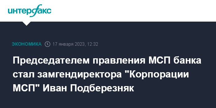 Москва. 17 января. INTERFAX.RU - Председателем правления МСП банка назначен бывший заместитель генерального директора "Корпорации МСП" Иван Подберезняк, сообщила пресс-служба банка.