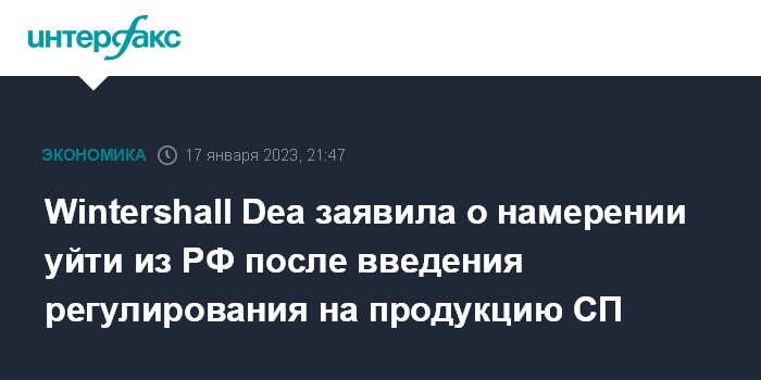 Москва. 17 января. INTERFAX.RU - Германская Wintershall Dea вслед за решением президента и правительства РФ о введении регулируемых цен на продукцию и услуги совместных предприятий, которое она назвала "экономической экспроприацией", объявила о намерении покинуть Россию.