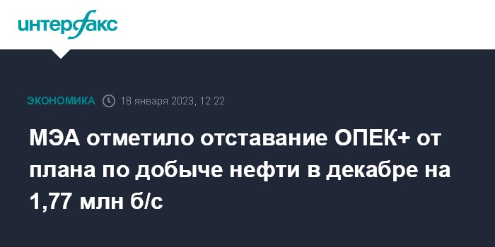 Москва. 18 января. INTERFAX.RU - В декабре 2022 года страны-участницы соглашения ОПЕК+ добывали 38,33 млн б/с нефти, в то время как по условиям соглашения могли извлекать 40,1 млн б/с, подсчитали аналитики Международного энергетического агентства (МЭА).