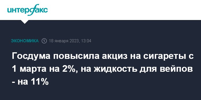 Москва. 18 января. INTERFAX.RU - Госдума приняла в третьем чтении закон, который внепланово повышает акцизы на сигареты и папиросы в РФ с 1 марта 2023 года на 2%, до 2 603 рубля за тысячу штук, при этом запланирован отказ от взимания акциза с электронных систем доставки никотина, но акциз на жидкость и табак для вейпов вырастет на 11%.