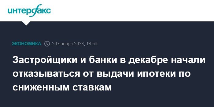 Москва. 20 января. INTERFAX.RU - Застройщики и банки в декабре начали отказываться от выдачи ипотеки по пониженным ставкам, что в краткосрочной перспективе может способствовать некоторому повышению кредитных ставок на первичном рынке, говорится в комментарии ЦБ "Денежно-кредитные условия и трансмиссионный механизм денежно-кредитной политики".