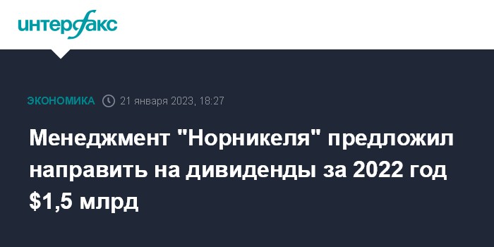 Москва. 21 января. INTERFAX.RU - Менеджмент "Норильского никеля" предложил направить на дивиденды за 2022 год $1,5 млрд, сообщило агентство РБК со ссылкой на три источника, близких к совету директоров "Норникеля".