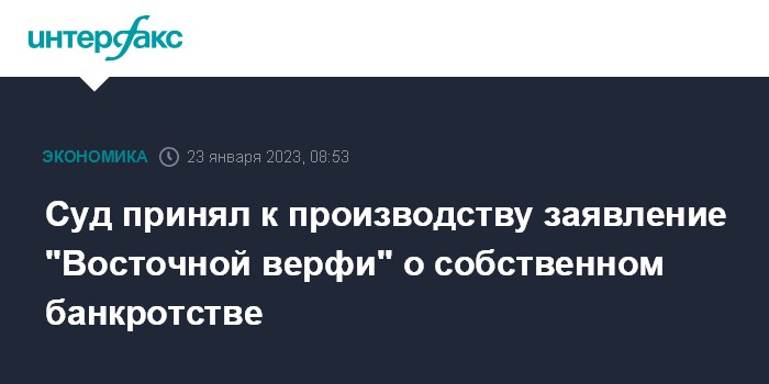 Москва. 23 января. INTERFAX.RU - Арбитражный суд Приморского края принял к производству заявление АО "Восточная верфь" (Владивосток) о собственном банкротств и, возбудил производство по делу, говорится в картотеке арбитражных дел.