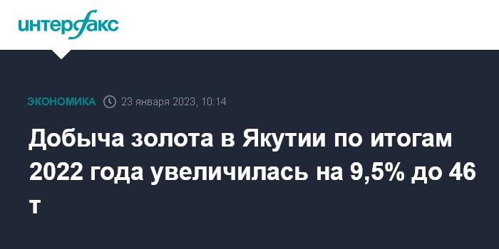 Добыча золота в Якутии по итогам 2022 года увеличилась на 9,5% до 46 т
