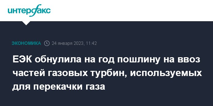 Москва. 24 января. INTERFAX.RU - Коллегия Евразийской экономической комиссии (ЕЭК) обнулила ставку ввозной таможенной пошлины для частей газовых турбин мощностью от 5 до 50 тысяч кВт на срок до 31 марта 2024 года включительно