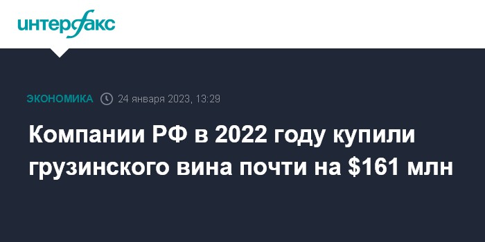 Москва. 24 января. INTERFAX.RU - Российские компании в 2022 году приобрели грузинского вина почти на $161 млн, или 73 128 тонн, сообщила Национальная служба статистики Грузии.
