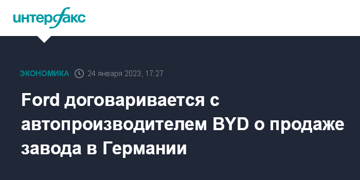Москва. 24 января. INTERFAX.RU - Ford Motor Co. ведет переговоры с китайским автопроизводителем BYD Co. о продаже предприятия в Германии, которое сейчас выпускает модель Focus, пишет The Wall Street Journal со ссылкой на информированные источники.