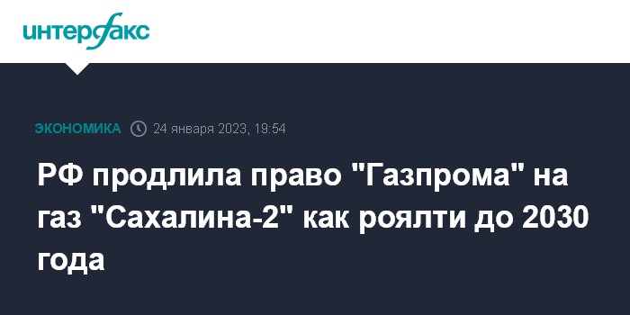 Москва. 24 января. INTERFAX.RU - Срок использования природного газа, причитающегося России в счет регулярных платежей за добычу полезных ископаемых (роялти) и в виде доли прибыльной продукции от реализации соглашения о разделе продукции по проекту "Сахалин-2", для поставок потребителям Дальневосточного федерального округа продлен до конца 2030 года.