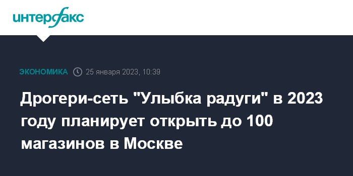 Москва. 25 января. INTERFAX.RU - Сеть "Улыбка радуги", работающая в формате дрогери, в 2023 году планирует открыть от 70 до 100 магазинов в Москве, сообщила пресс-служба компании.