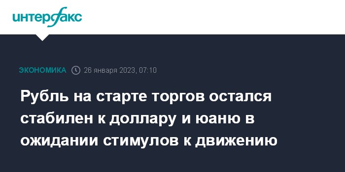 Москва. 26 января. INTERFAX.RU - Доллар США стабилен, юань слегка подрастает на Московской бирже на старте торгов в четверг, рубль не меняется на фоне отсутствия заметных стимулов к движению.