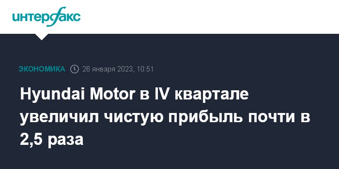 Москва. 26 января. INTERFAX.RU - Крупнейший южнокорейский автопроизводитель Hyundai Motor в четвертом квартале 2022 года увеличил чистую прибыль почти в 2,5 раза в годовом выражении, однако это не оправдало ожиданий аналитиков.