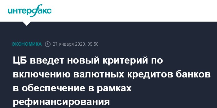 Москва. 27 января. INTERFAX.RU - Банк России вводит новый критерий в условия предоставления банкам обеспеченных кредитов: в договорах по предоставляемым в обеспечение регулятору ссудам в валюте должно быть закреплено право кредиторов требовать выплат по ним в рублях, следует из сообщения регулятора.