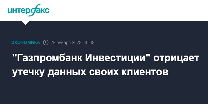 Москва. 28 января. INTERFAX.RU - "Газпромбанк Инвестиции" опровергло информацию об утечке данных своих клиентов, опубликованную в социальных сетях.