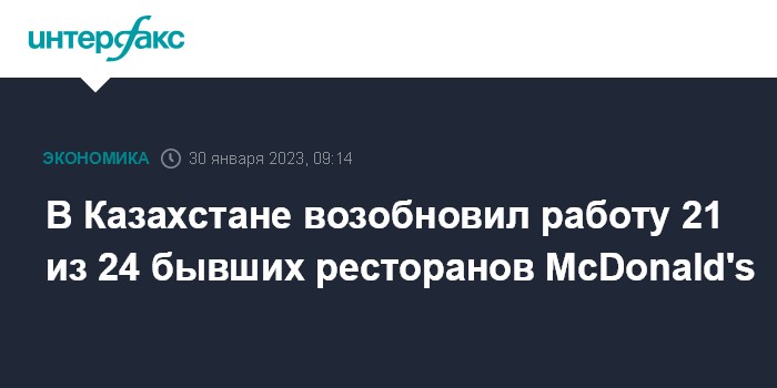 Москва. 30 января. INTERFAX.RU - В Казахстане возобновил работу 21 ресторан из 24, которые принадлежат ТОО "Food Solutions KZ" и раньше работали под брендом McDonald's. Об этом сообщила пресс-служба управляющей компании.