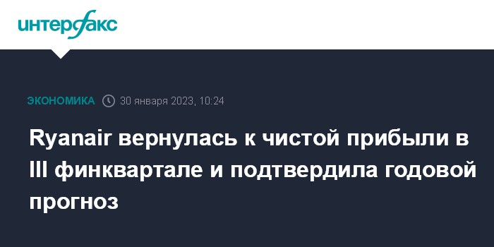 Москва. 30 января. INTERFAX.RU - Ирландская Ryanair Holdings Plc, крупнейший в Европе авиаперевозчик-дискаунтер, в третьем квартале 2023 финансового года получила чистую прибыль и подтвердила прогноз на текущий фингод в целом.