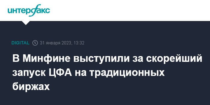 Москва. 31 января. INTERFAX.RU - Минфин выступает за скорейший запуск обращения цифровых финансовых активов (ЦФА) на традиционных биржах, пора ускориться с принятием соответствующих решений, заявил на конференции директор департамента финансовой политики министерства Иван Чебесков.