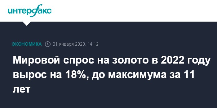 Москва. 31 января. INTERFAX.RU - В 2022 году мировой спрос на золото увеличился на 18% и достиг 4741 тонны, что является максимумом с 2011 года, говорится в ежегодном отчете World Gold Council (WGC).