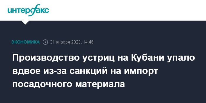 Москва. 31 января. INTERFAX.RU - В 2022 году производство устриц на Кубани снизилось в 1,9 раза из-за санкций, сообщили в Минсельхозе Краснодарского края.