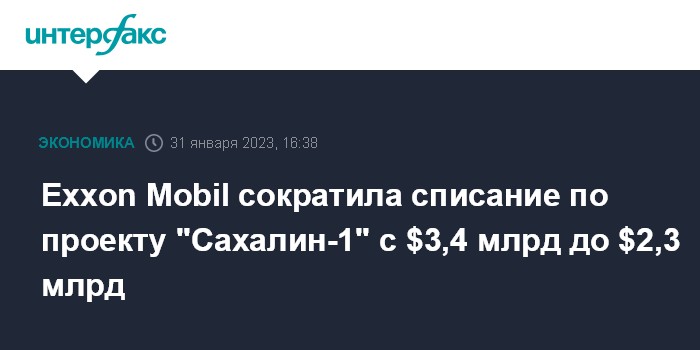 Москва. 31 января. INTERFAX.RU - Exxon Mobil Corp по итогам 2022 года списала по проекту "Сахалин-1" $2,3 млрд, сообщается в материалах компании к конференц-коллу.