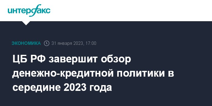 Москва. 31 января. INTERFAX.RU - Банк России продолжает работы по обзору денежно-кредитной политики (ДКП), завершит этот процесс в середине 2023 года, говорится в сообщении ЦБ.