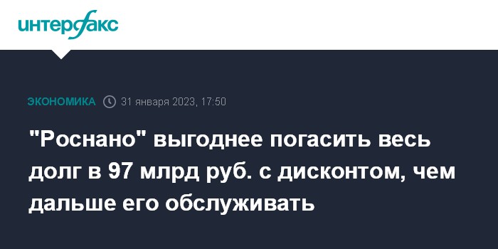 "Роснано" выгоднее погасить весь долг в 97 млрд руб. с дисконтом, чем дальше его обслуживать