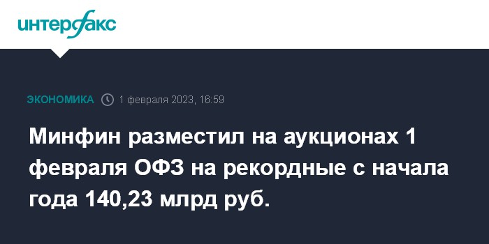 Минфин разместил на аукционах 1 февраля ОФЗ на рекордные с начала года 140,23 млрд руб.