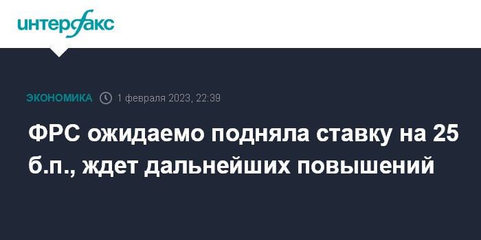 Москва. 1 февраля. INTERFAX.RU - Федеральная резервная система (ФРС) повысила процентную ставку по федеральным кредитным средствам (federal funds rate) на 25 базисных пунктов, теперь ее диапазон составляет 4,5-4,75% годовых, говорится в сообщении Федерального комитета по операциям на открытых рынках (FOMC) по итогам заседания.
