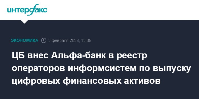 Москва. 2 февраля. INTERFAX.RU - Банк России внес Альфа-банк в реестр операторов информационных систем, в которых осуществляется выпуск цифровых финансовых активов (ЦФА), сообщается на сайте регулятора.