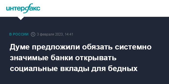 Москва. 3 февраля. INTERFAX.RU - Законодатели хотят обязать системно значимые банки с 1 июля 2024 года открывать вклады и счета для малообеспеченного населения, остальные кредитные организации смогут предлагать такие продукты не позднее 1 июля 2025 года, следует из законопроекта, с которым ознакомился "Интерфакс".