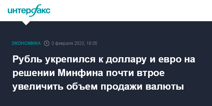 Минфин РФ с 7 февраля по 6 марта планирует направить на продажу иностранной валюты в рамках бюджетного правила средства объемом 160,2 млрд рублей, ежедневный объем продажи составит эквивалент 8,9 млрд рублей, говорится в сообщении министерства. С 13 января по 6 февраля объем ежедневных продаж составляет 3,2 млрд рублей. Таким образом, ежедневный объем продаж в феврале увеличится в 2,8 раза.