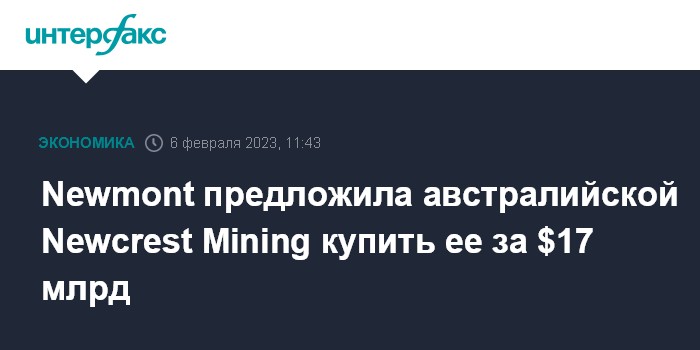 Москва. 6 февраля. INTERFAX.RU - Американская Newmont Corp. сделала предложение о покупке австралийской Newcrest Mining Ltd. за сумму около $17 млрд, сделка может стать одной из крупнейших в отрасли.